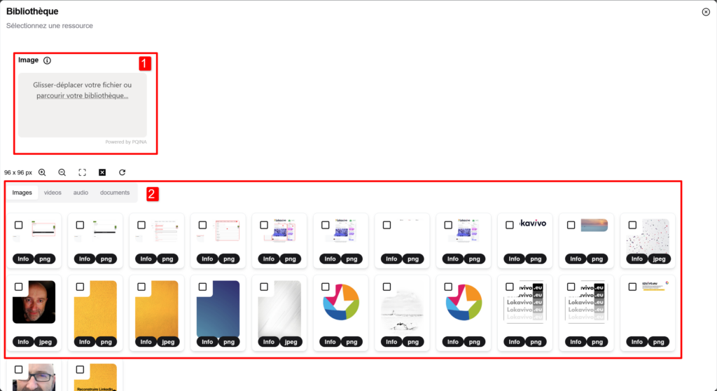 Pour cela, cliquez sur le bouton « Ajouter une ressource (image…) » et soit vous en choisissez une dans votre photothèque/vidéothèque, soit vous en créez une…